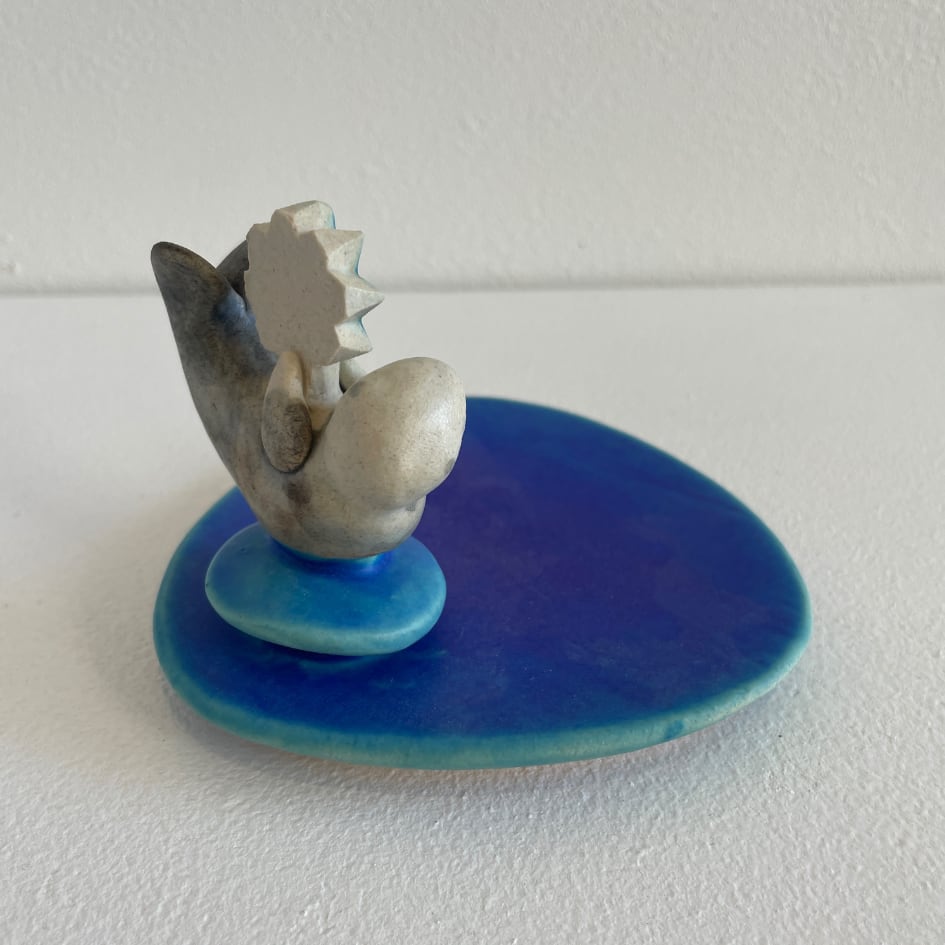 青い作品を中心に、お地蔵さんのような”やさしさ”や”祈り”を感じられるような作品を作りたいと思い制作しています。